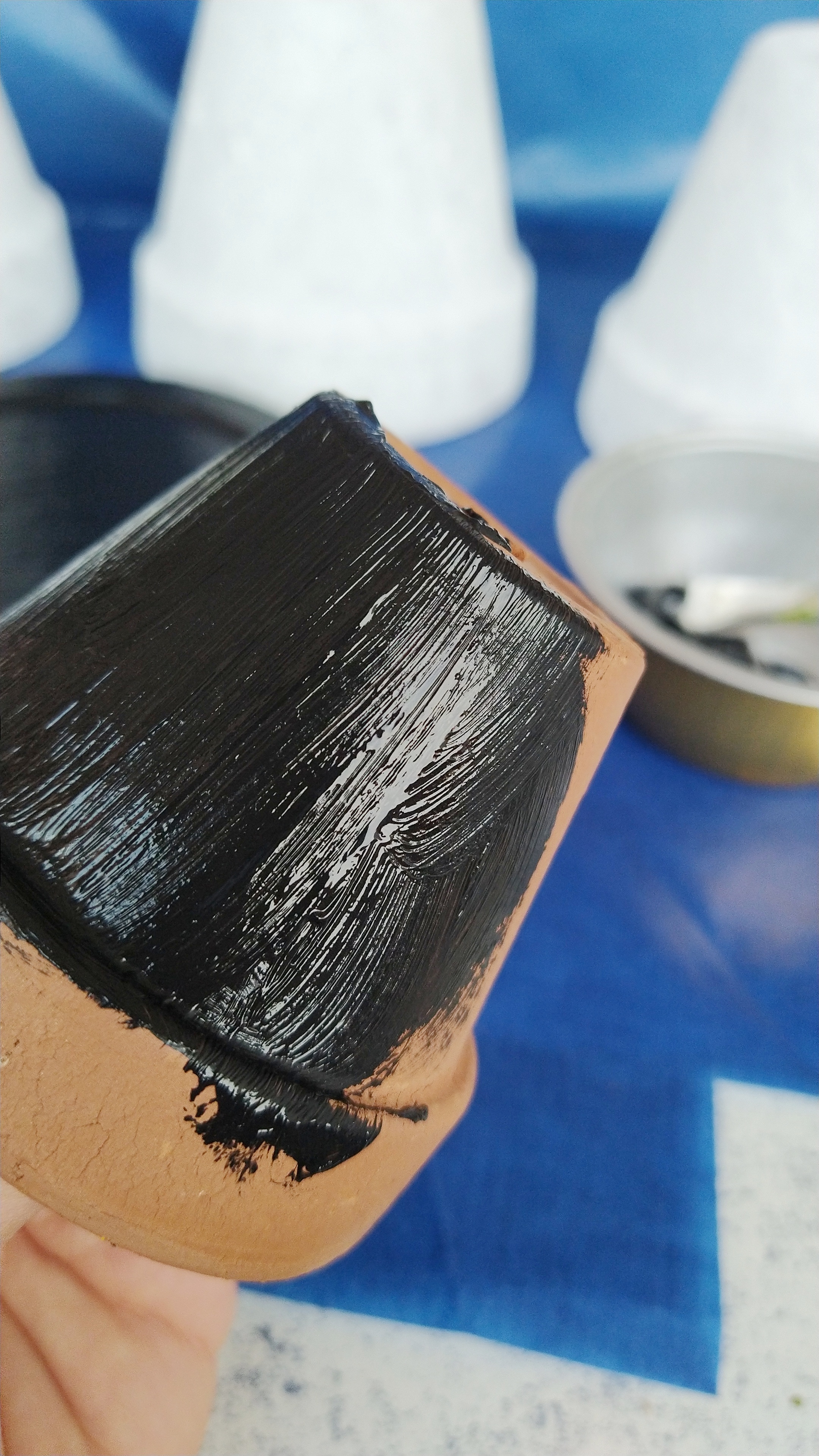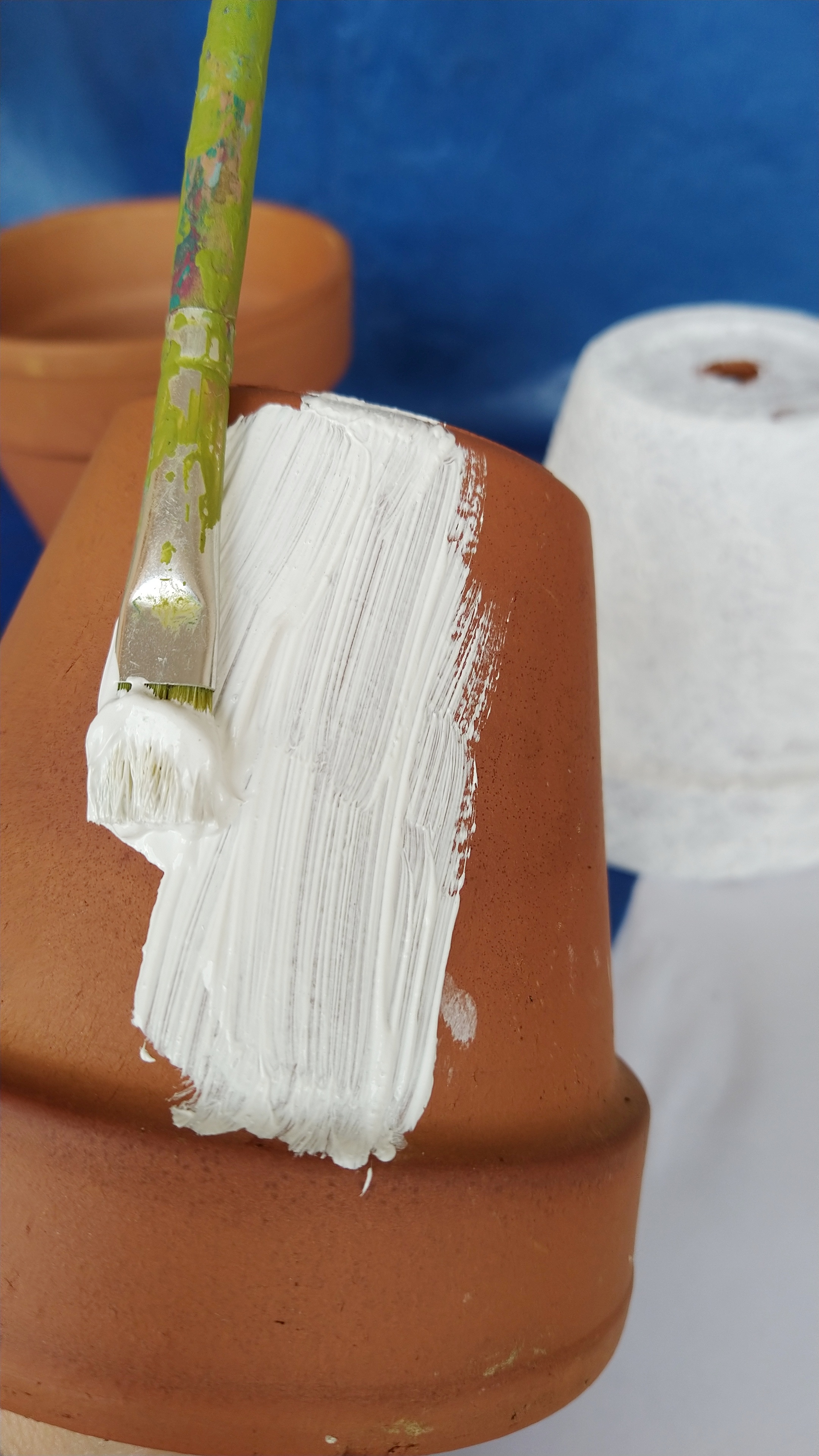 1. Bemale die drei gleich großen Tontöpfe mit weißer Farbe.
